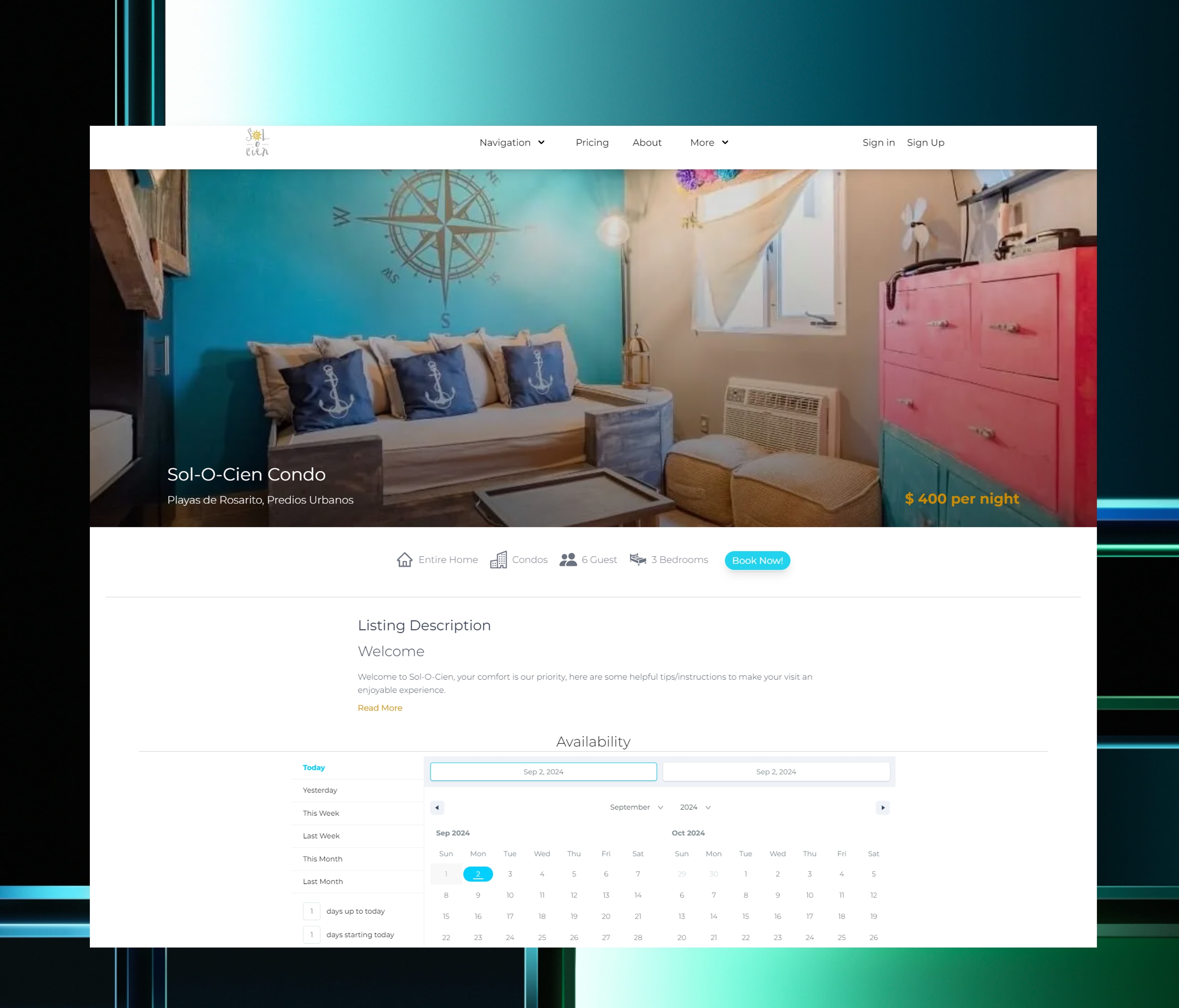 DGTL PROS LLC recently partnered with Sol O Cien Adventures to enhance their online presence and streamline their booking process. Sol O Cien Adventures is a premier hotel booking site specializing in luxurious condo rentals in Rosarito, Mexico. Our mission was to develop a comprehensive website and database solution that seamlessly integrates with Stripe, enabling them to manage client bookings, accept payments, and deliver an exceptional user experience.